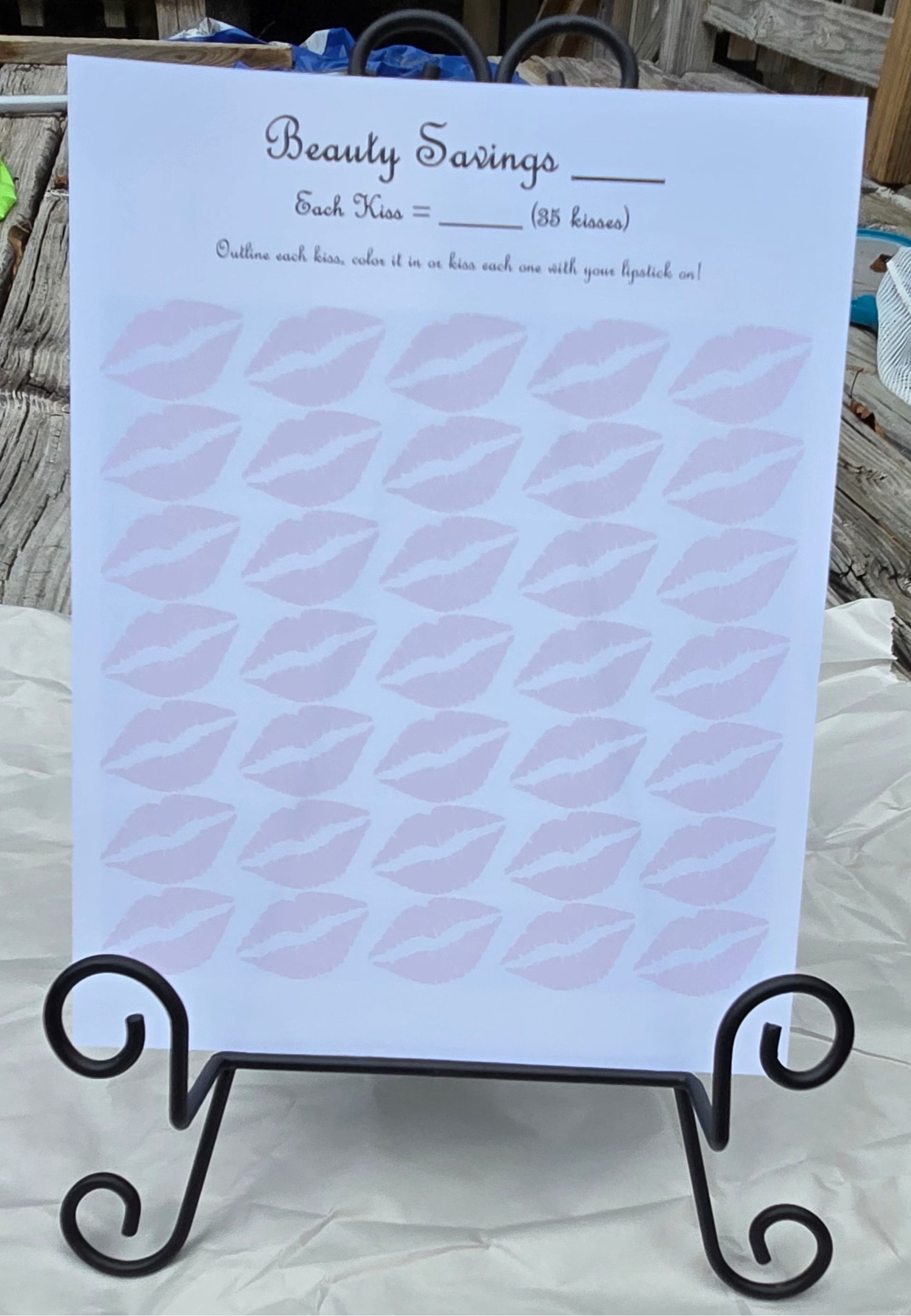 Don't kiss your money goodbye! Kiss it into your savings account! Choose an amount that each lip will be, then when you save that amount, either color in the lips or put on that bright red lipstick and give it a kiss! This 8 1/2 x 11 page is 65 lb cardstock and is a physical product that will be mailed. Lipstick not included!